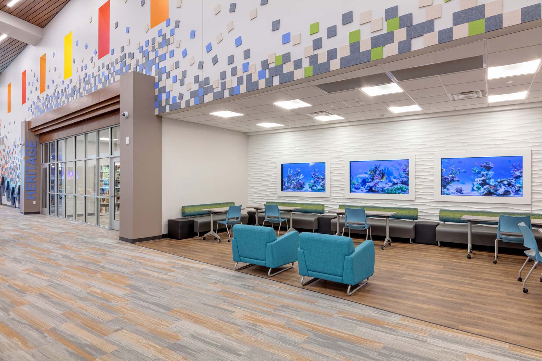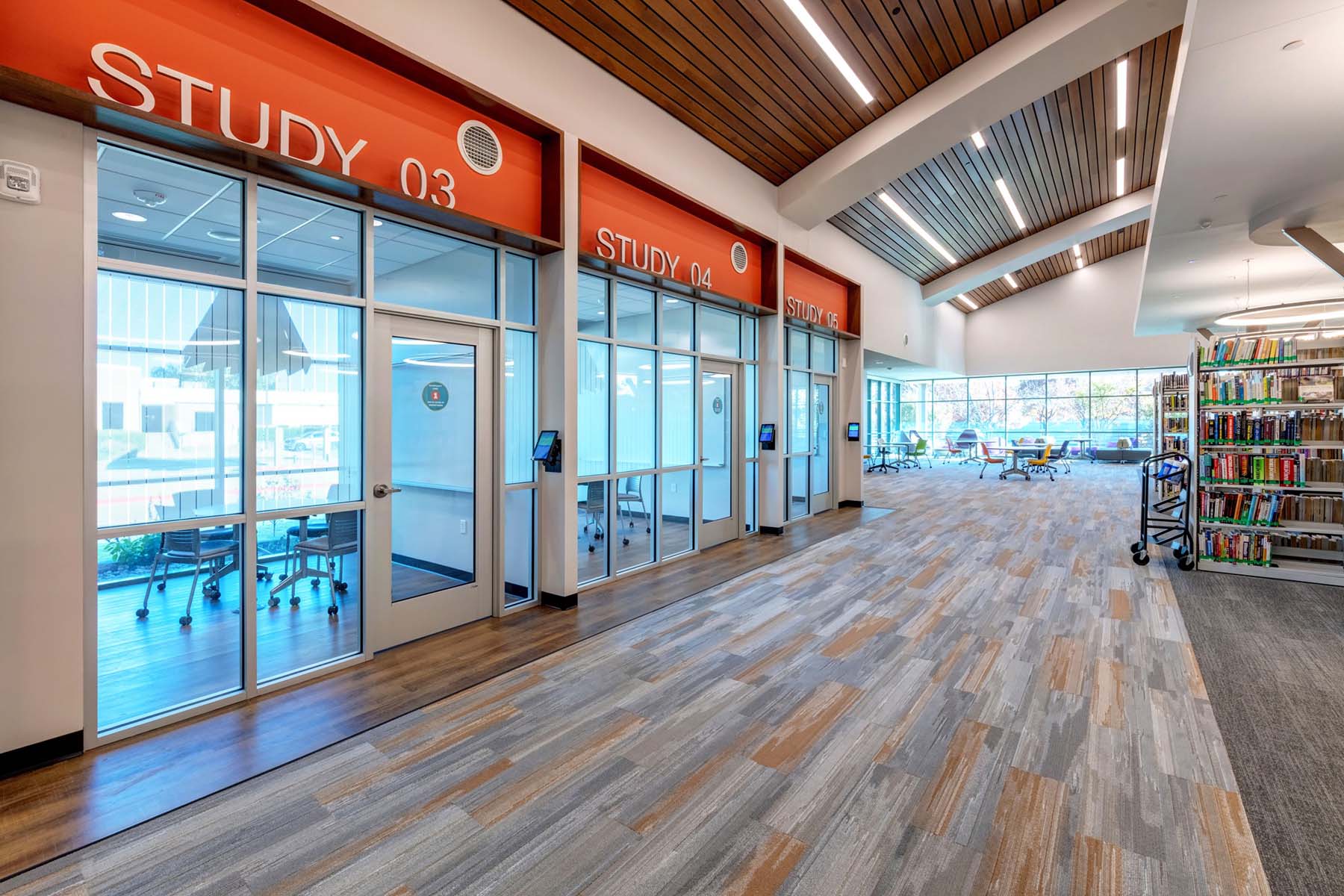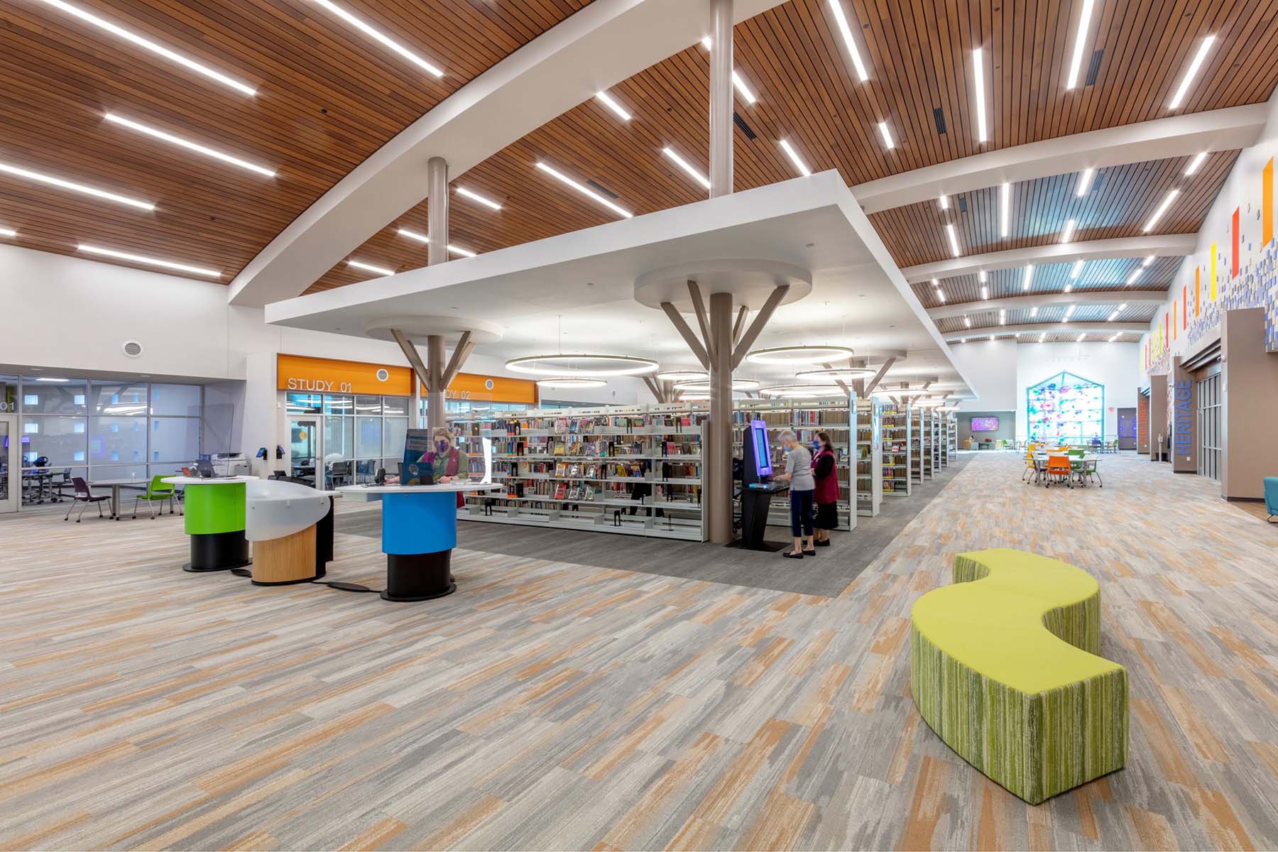This 14,000 sf renovation features the latest in technology and architectural design. The space was redesigned to include study rooms, conference rooms, and youth activity center. The architectural design includes arched rulon wood ceiling, large bubble wall, aquarium wall, walkways, canopies and new custom finishes throughout the space.